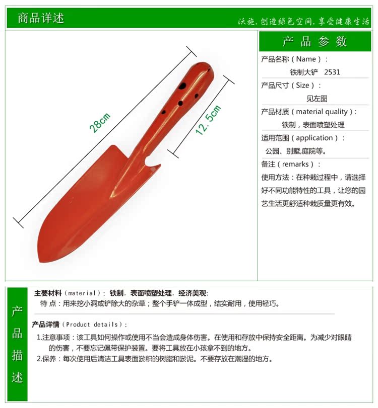 2.儿童方铲2856,红色喷塑防锈,硬杂木手柄,适合儿童园艺种植 尺寸:总长20.5厘米,铲面直径10厘米,宽度6.7厘米