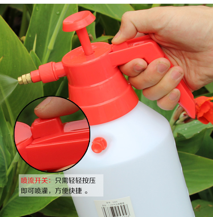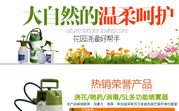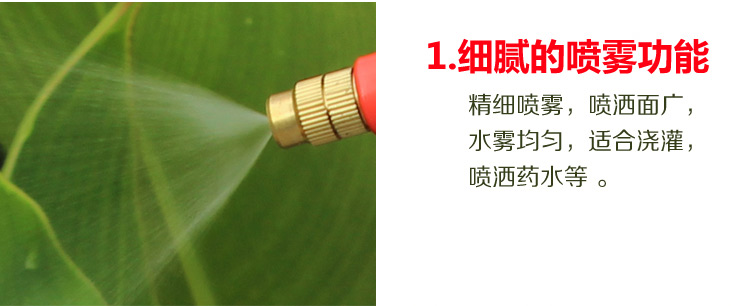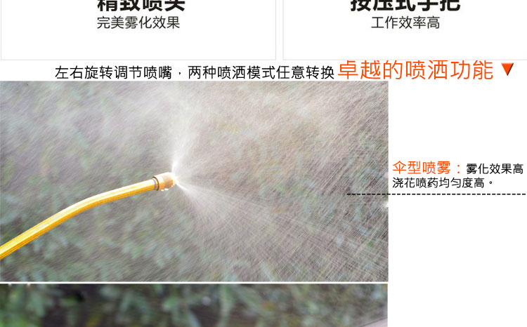 【产品特点】可通过调节喷嘴以获得直线或雾化的喷洒效果。结实耐用,方便调节,适用于大部分水管。使用起来很省力。大瓶的强度和安全性,有足够的容量花园喷涂应用;有自动放气阀,可以保持安全的工作压力;小巧轻便,易于携带。