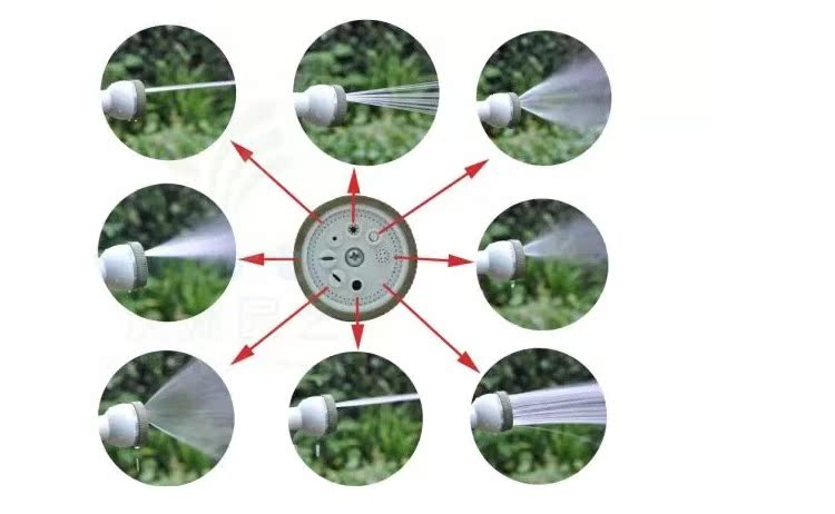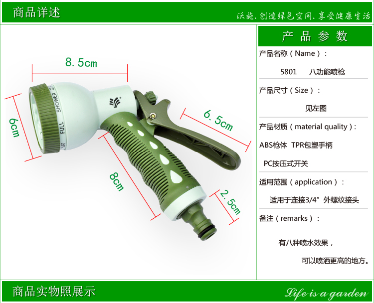 产品描述:喷枪嘴为铜制,英制螺纹接头,二功能调档,不同的喷洒效果,可定位喷洒,适合花园浇花、洗车