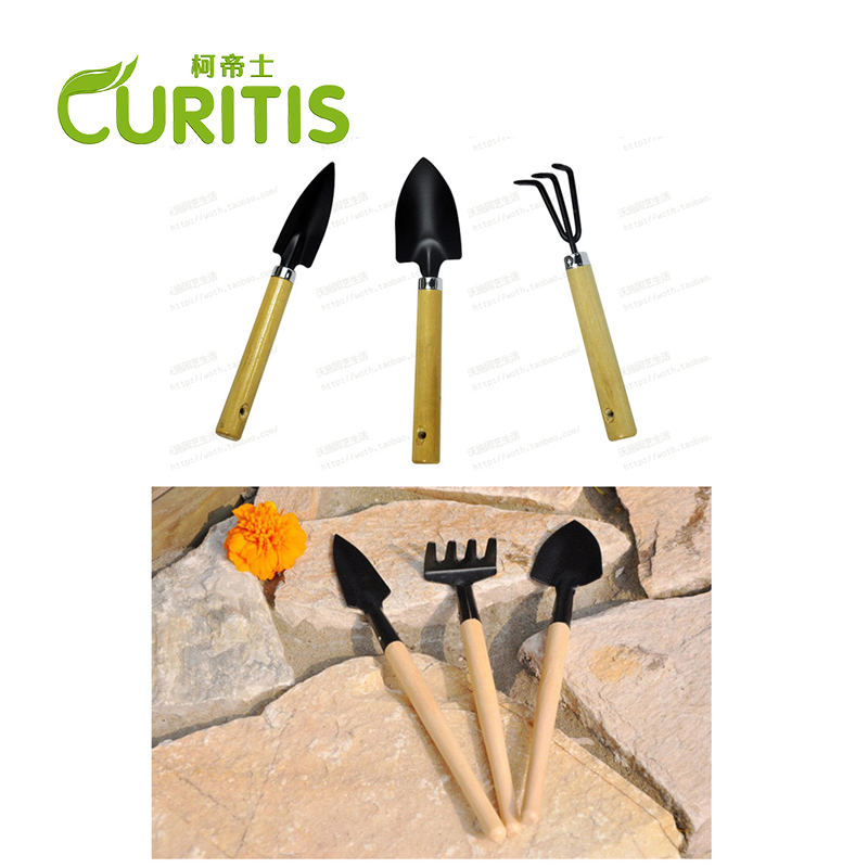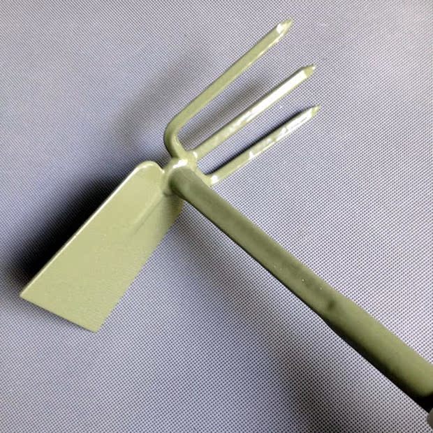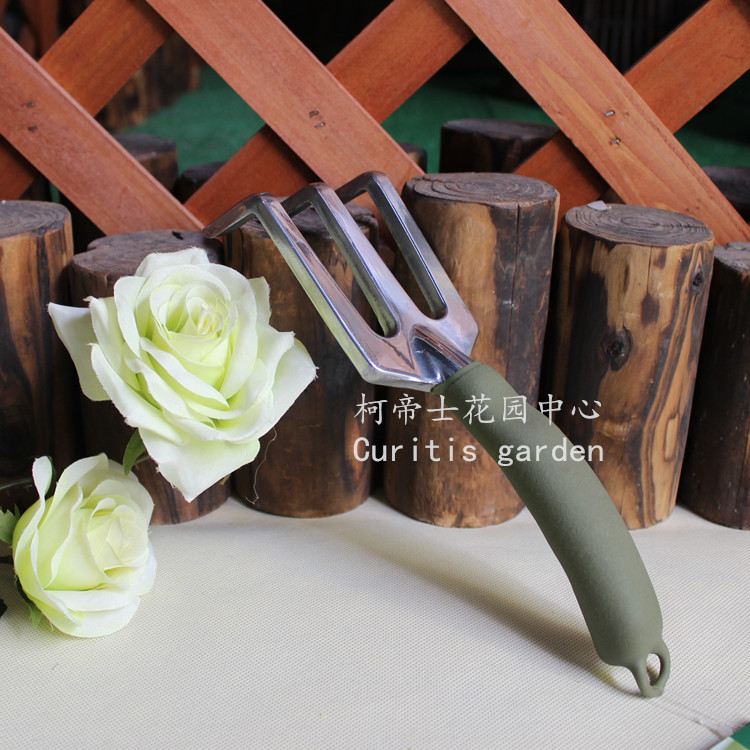3.儿童尖三耙2857,绿色喷塑防锈,硬杂木手柄,适合儿童园艺种植 尺寸:总长15厘米,铲面直径3.8厘米,宽度7.5厘米
