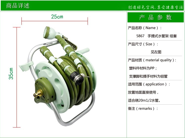 产品描述:水管架:镀锌铁件,手柄可折叠,绕15米1/2”水管